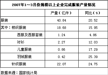 根据国家统计局统计显示:2007年1~3月份,我国规模以上服装企业累计完成服装产量40.84亿件,其中梭织服装18.68亿件,针织服装22.07亿件,与2006年同期相比分别提高了20.52%、15.95%和24.75%。产量增幅较2006年同期增幅有较大提高,针织服装生产增长较快。