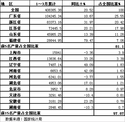 2007年1-3月份全国服装产量前15名省市情况(万件)